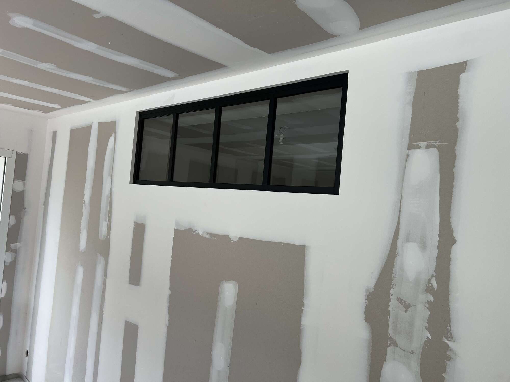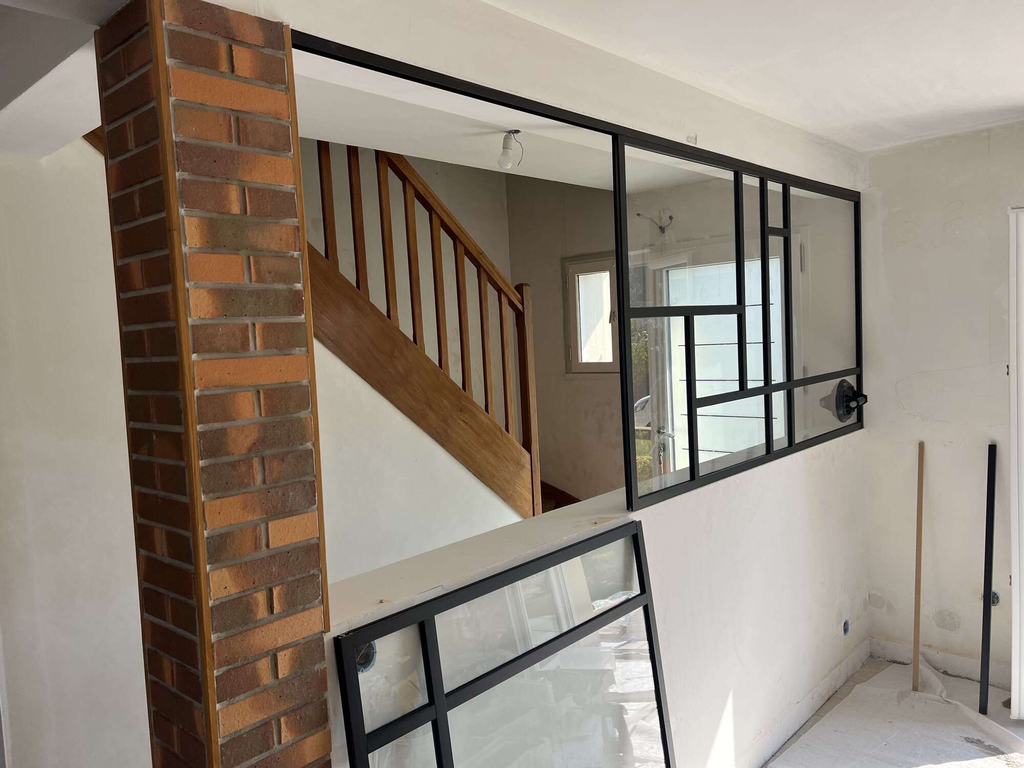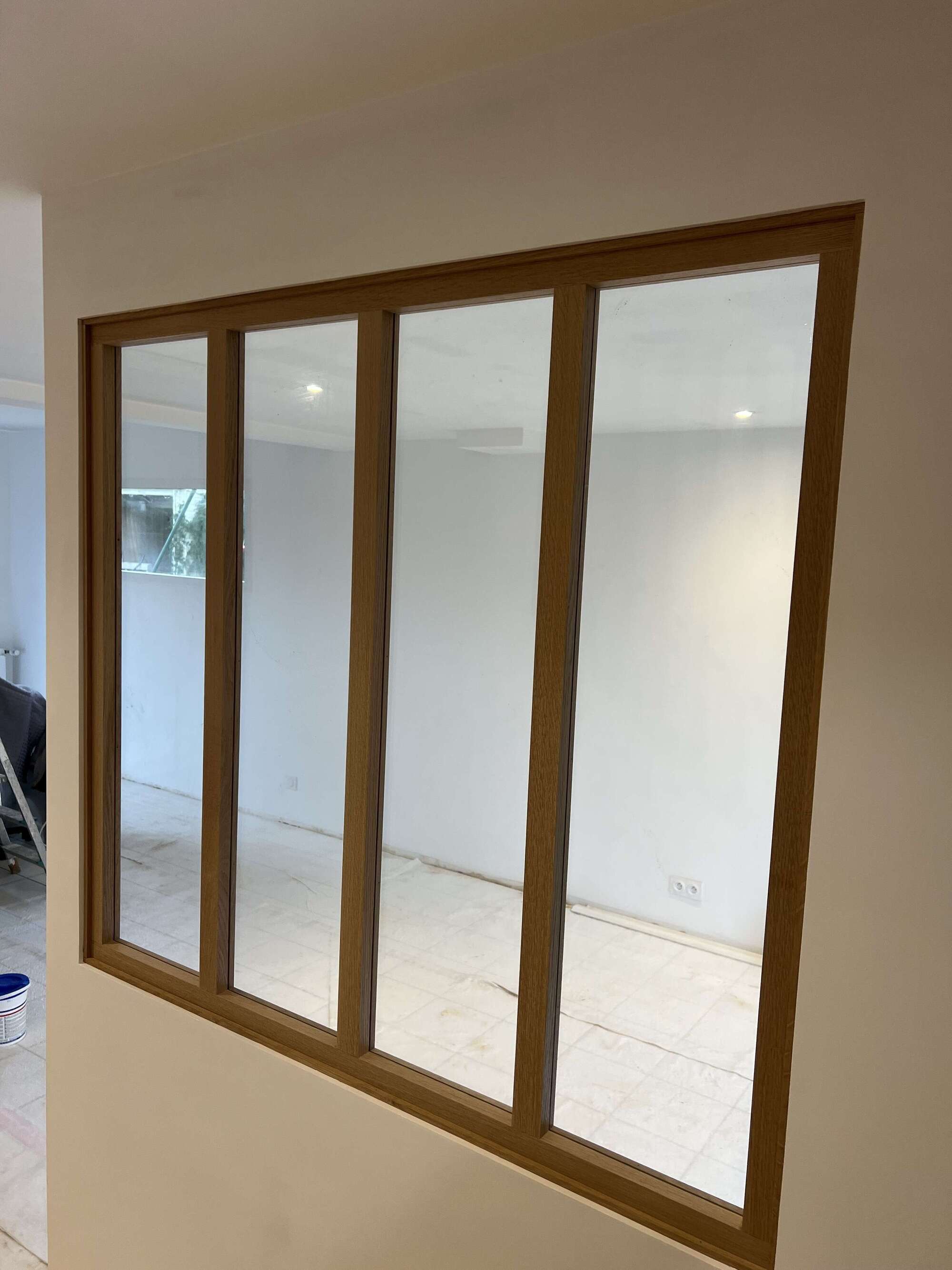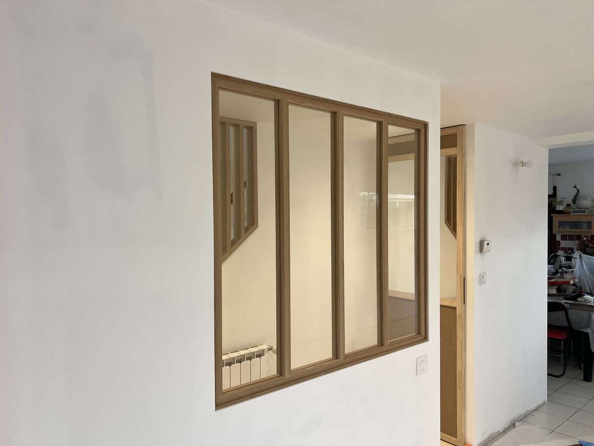 Création verrière fixe sur cuisine et verrière fixe avec coulissant, laqué noir mat. Réalisation des cloisons Placoplatre ainsi que le parquet.