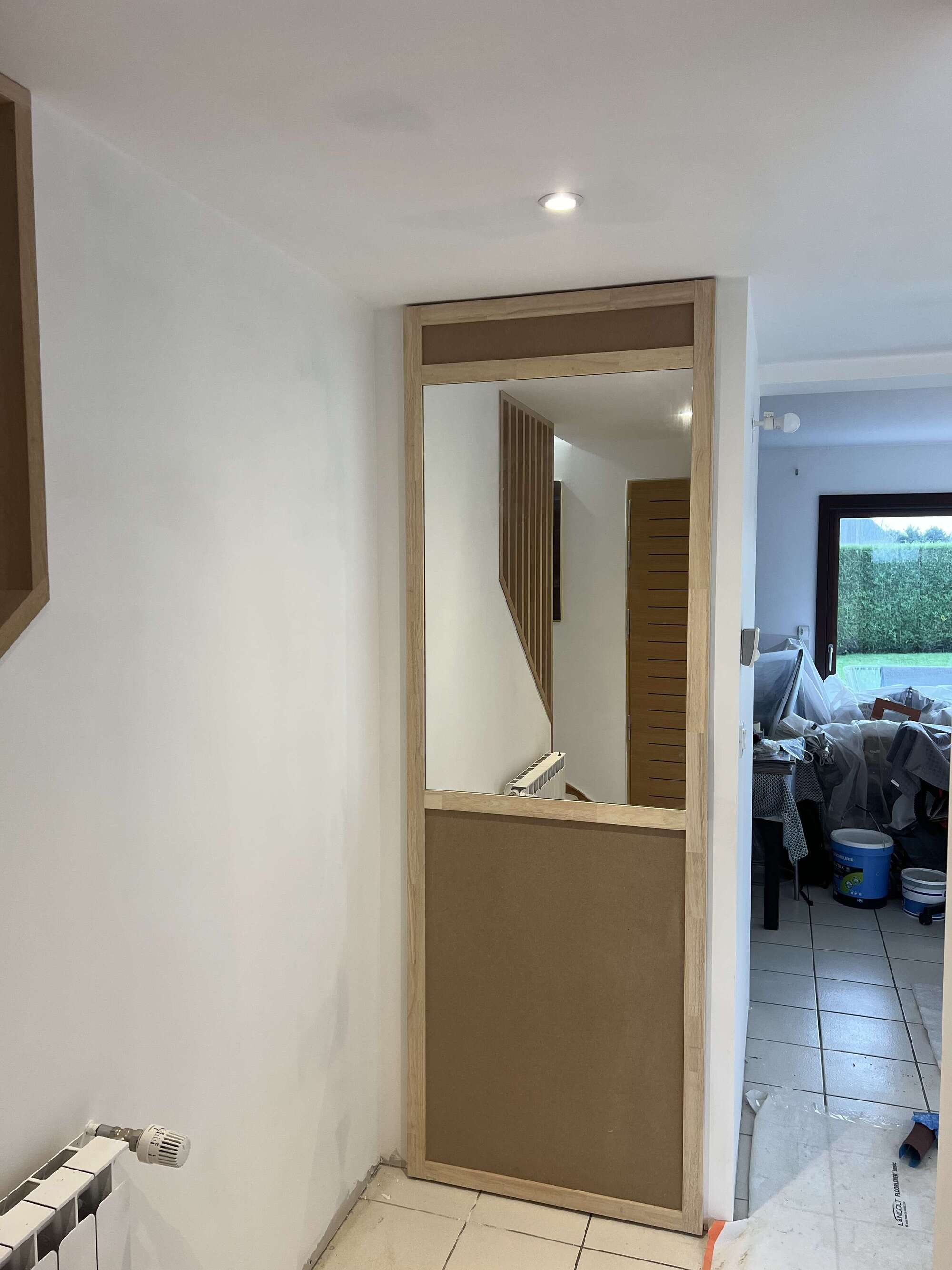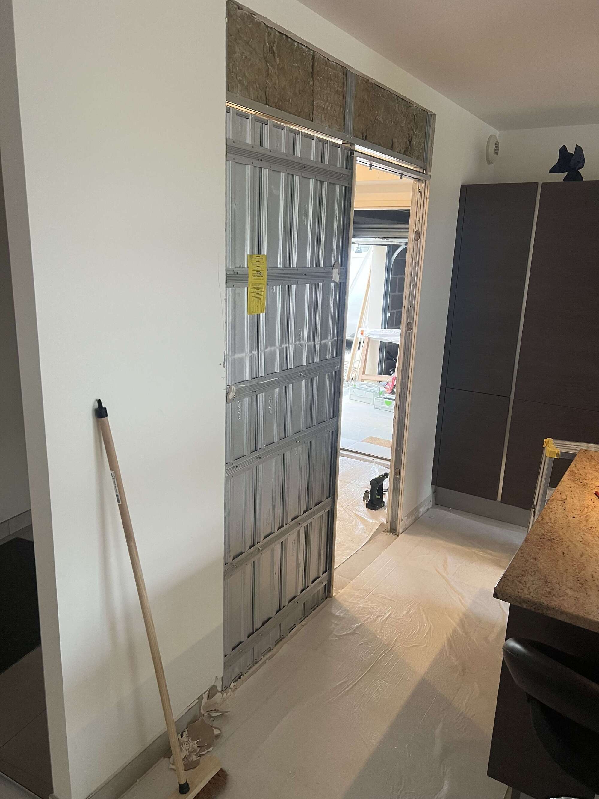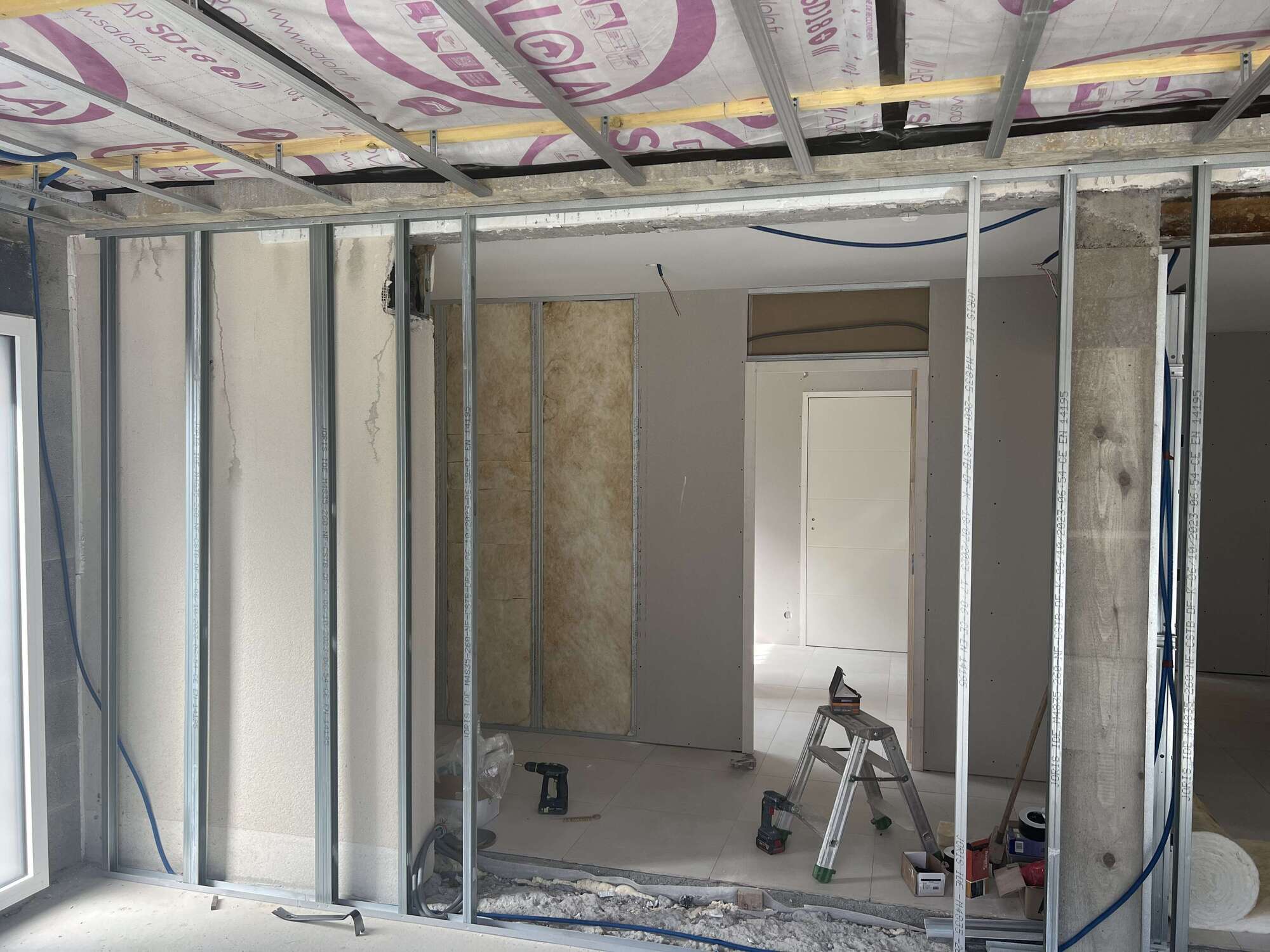 Création verrière fixe sur cuisine et verrière fixe avec coulissant, laqué noir mat. Réalisation des cloisons Placoplatre ainsi que le parquet.