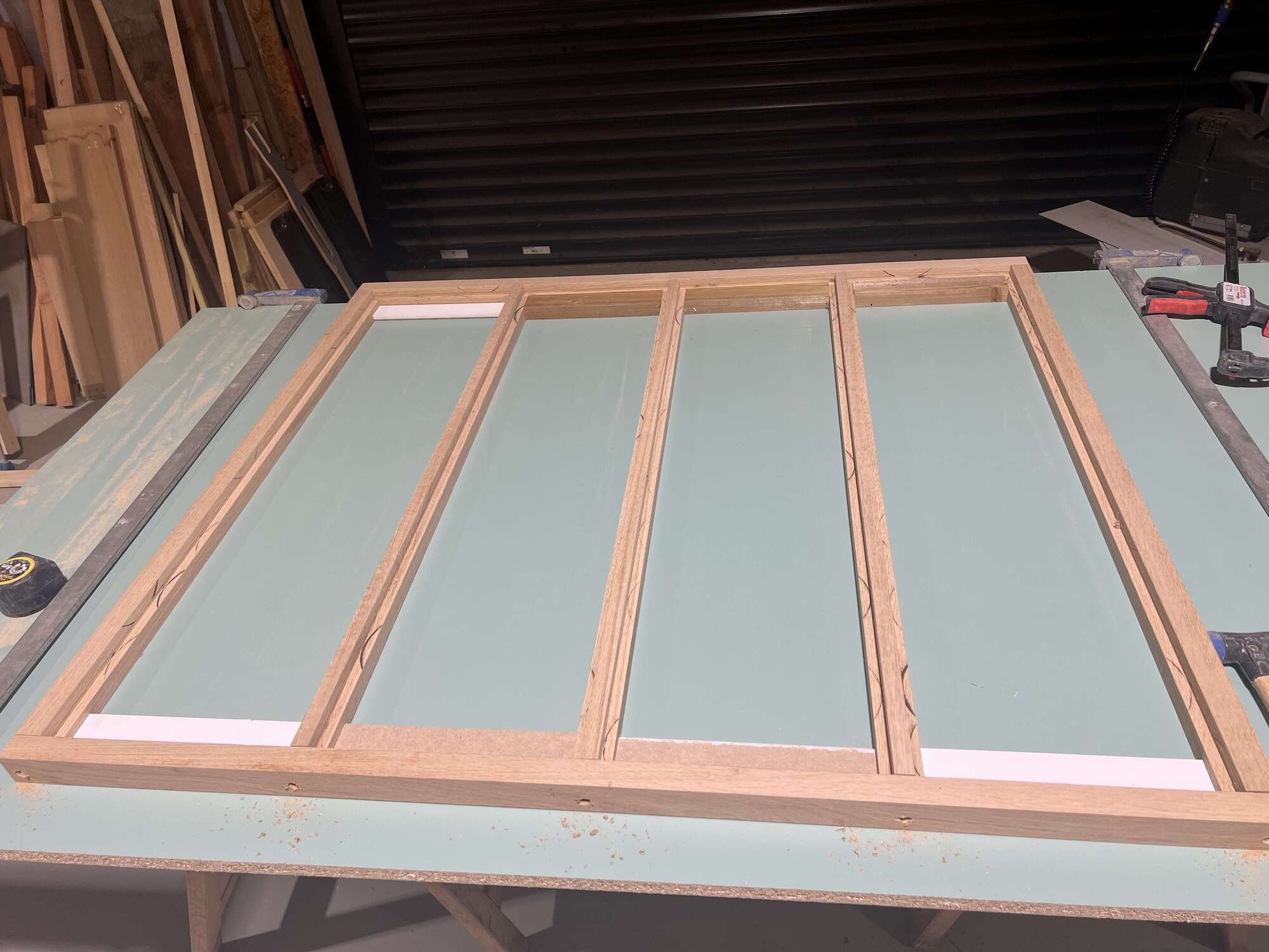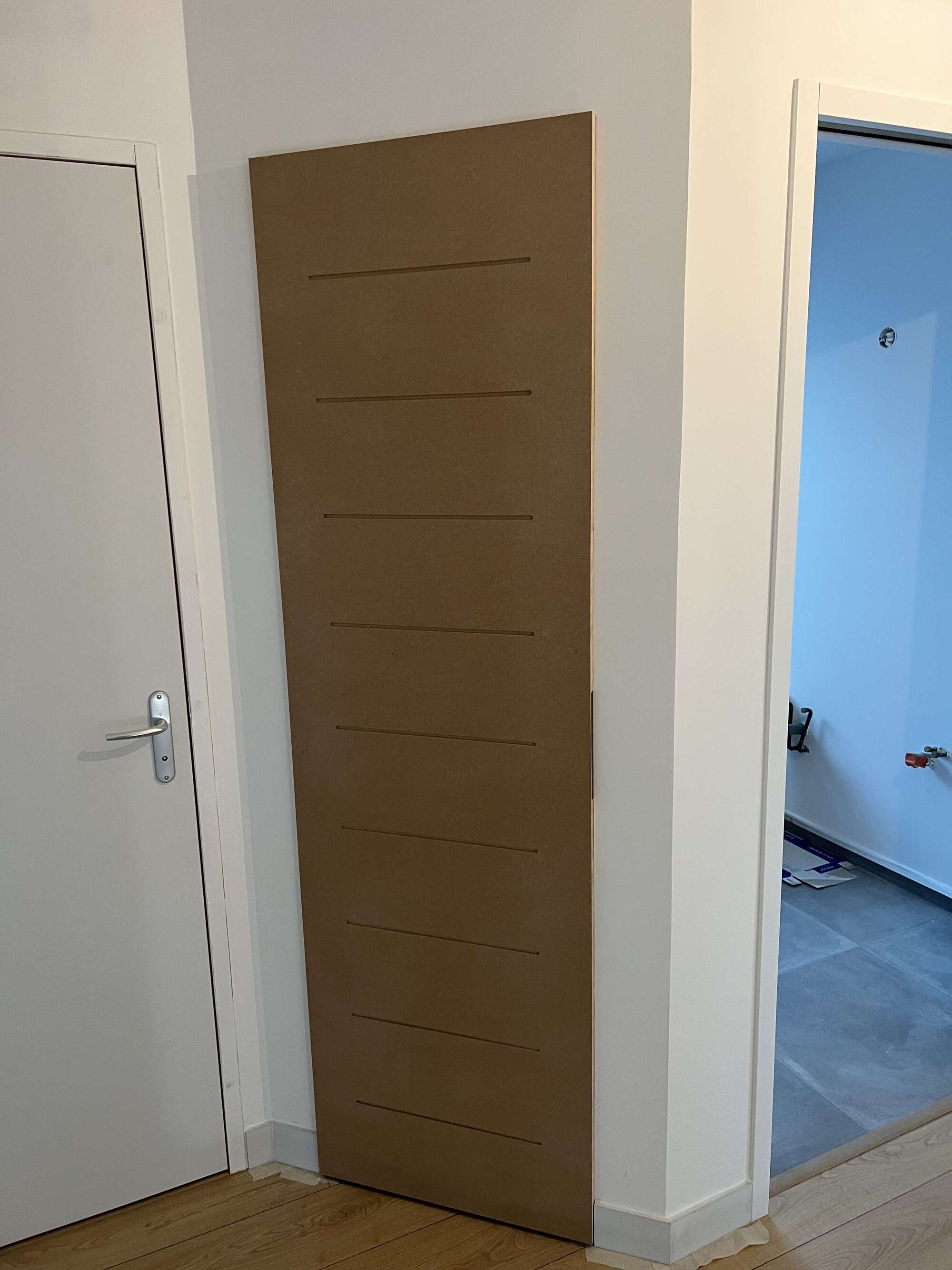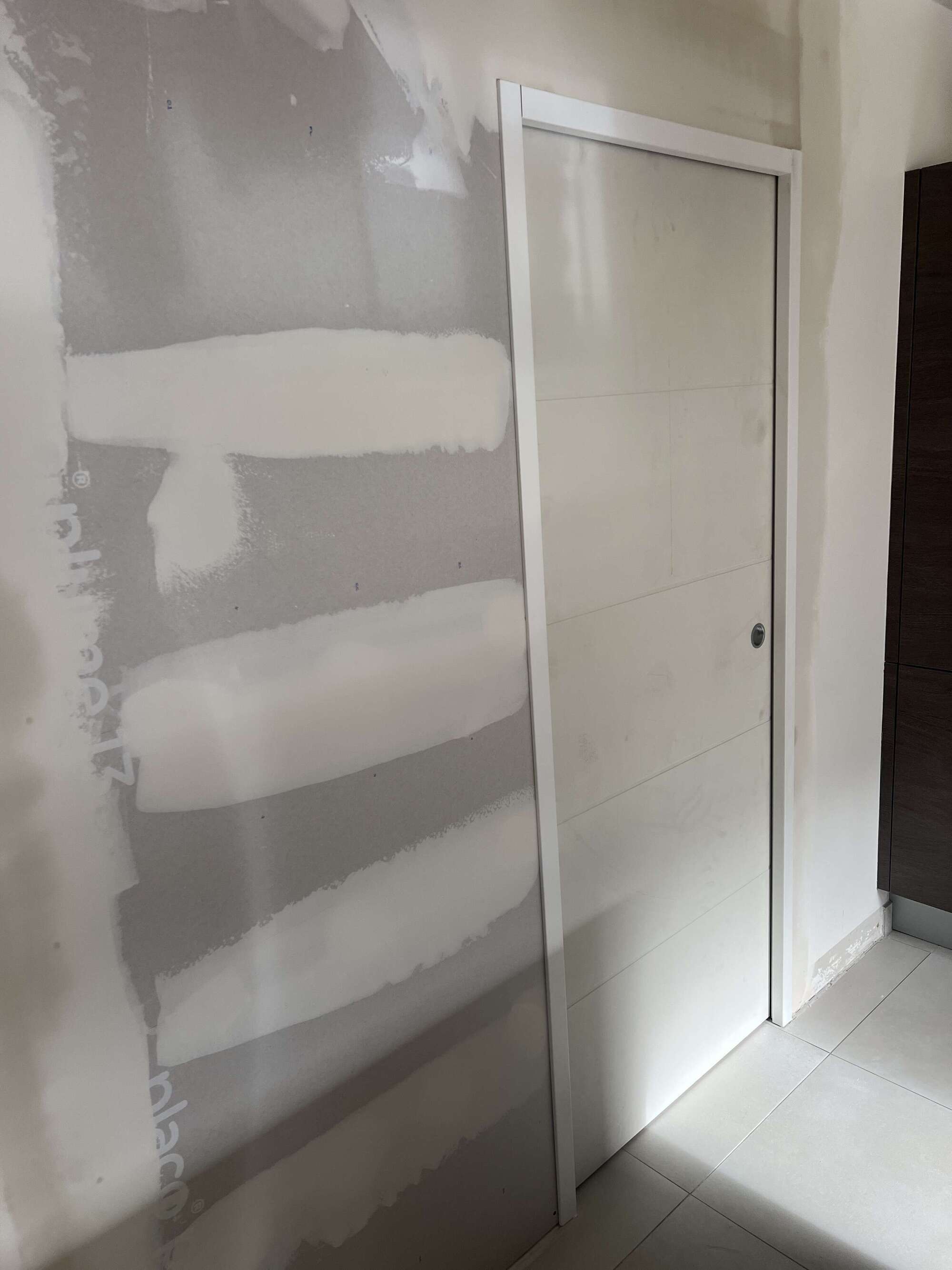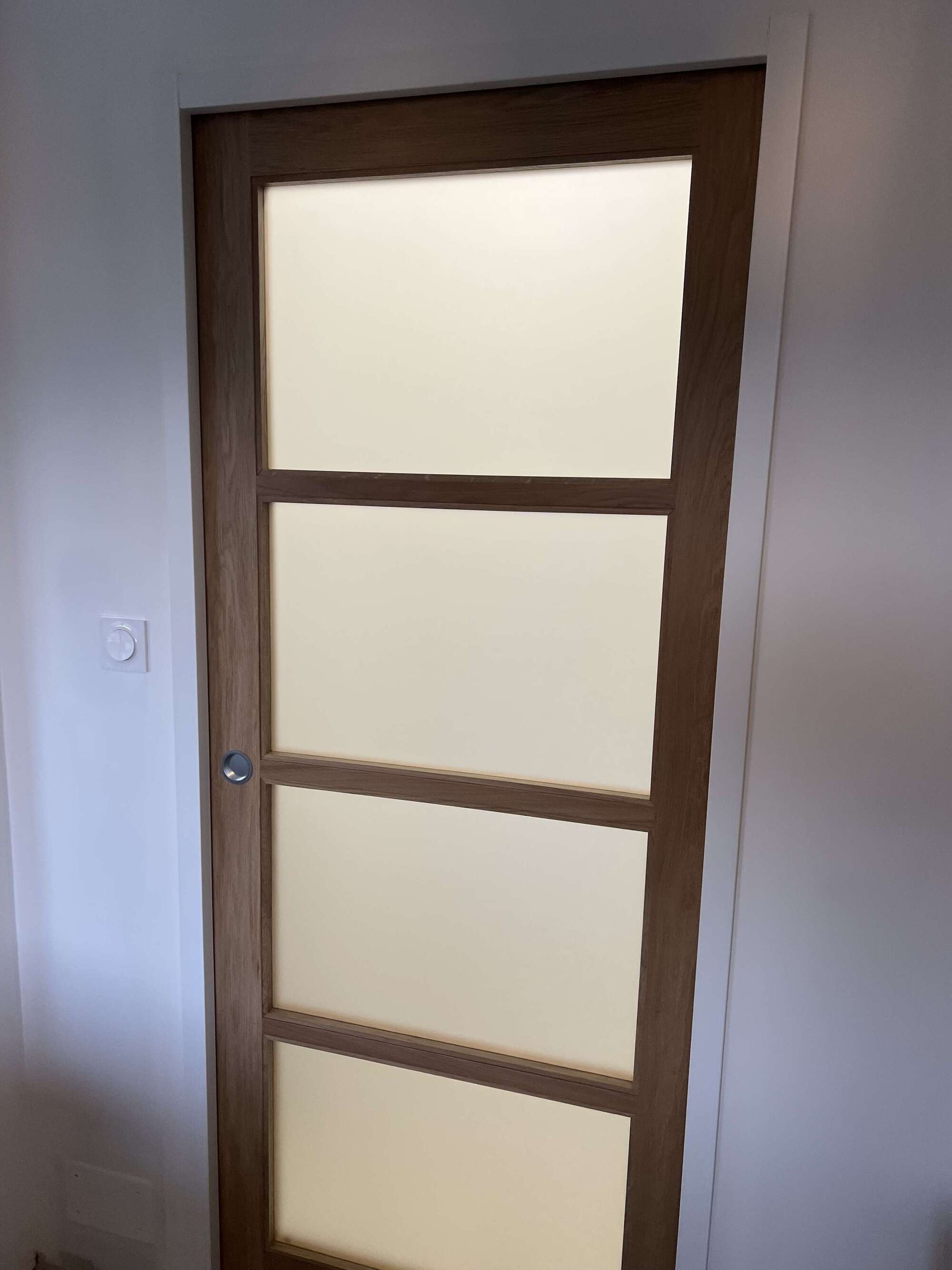 Création verrière fixe sur cuisine et verrière fixe avec coulissant, laqué noir mat. Réalisation des cloisons Placoplatre ainsi que le parquet.