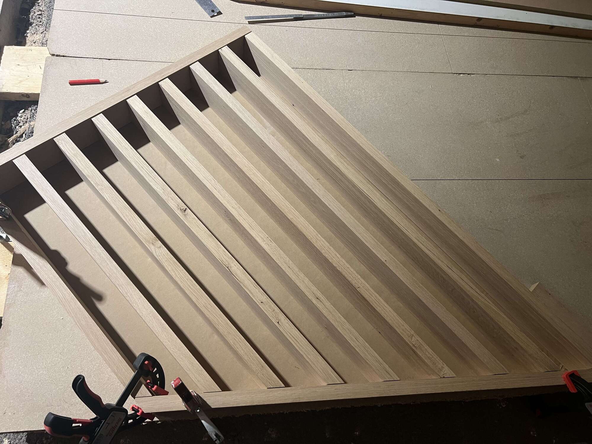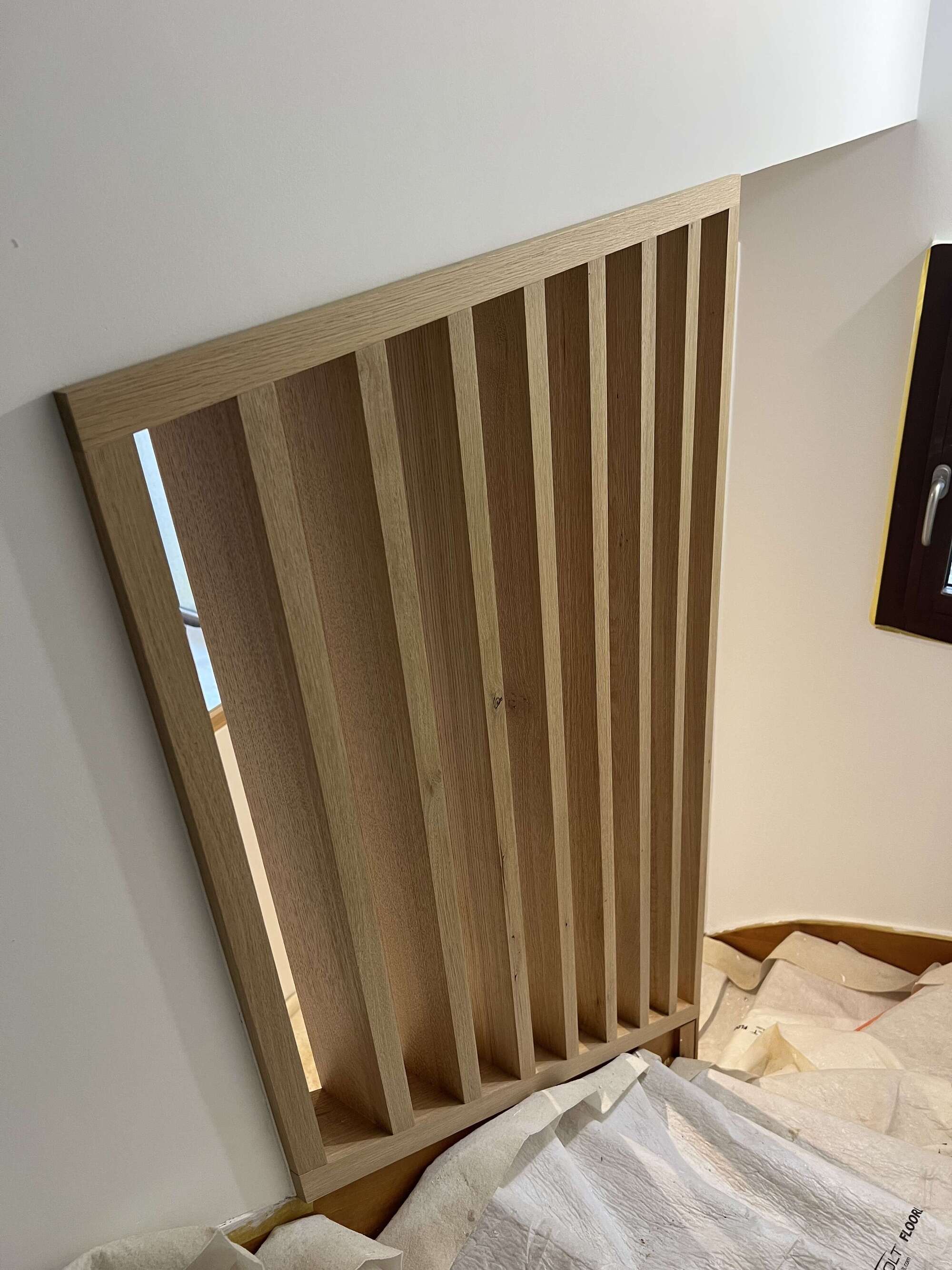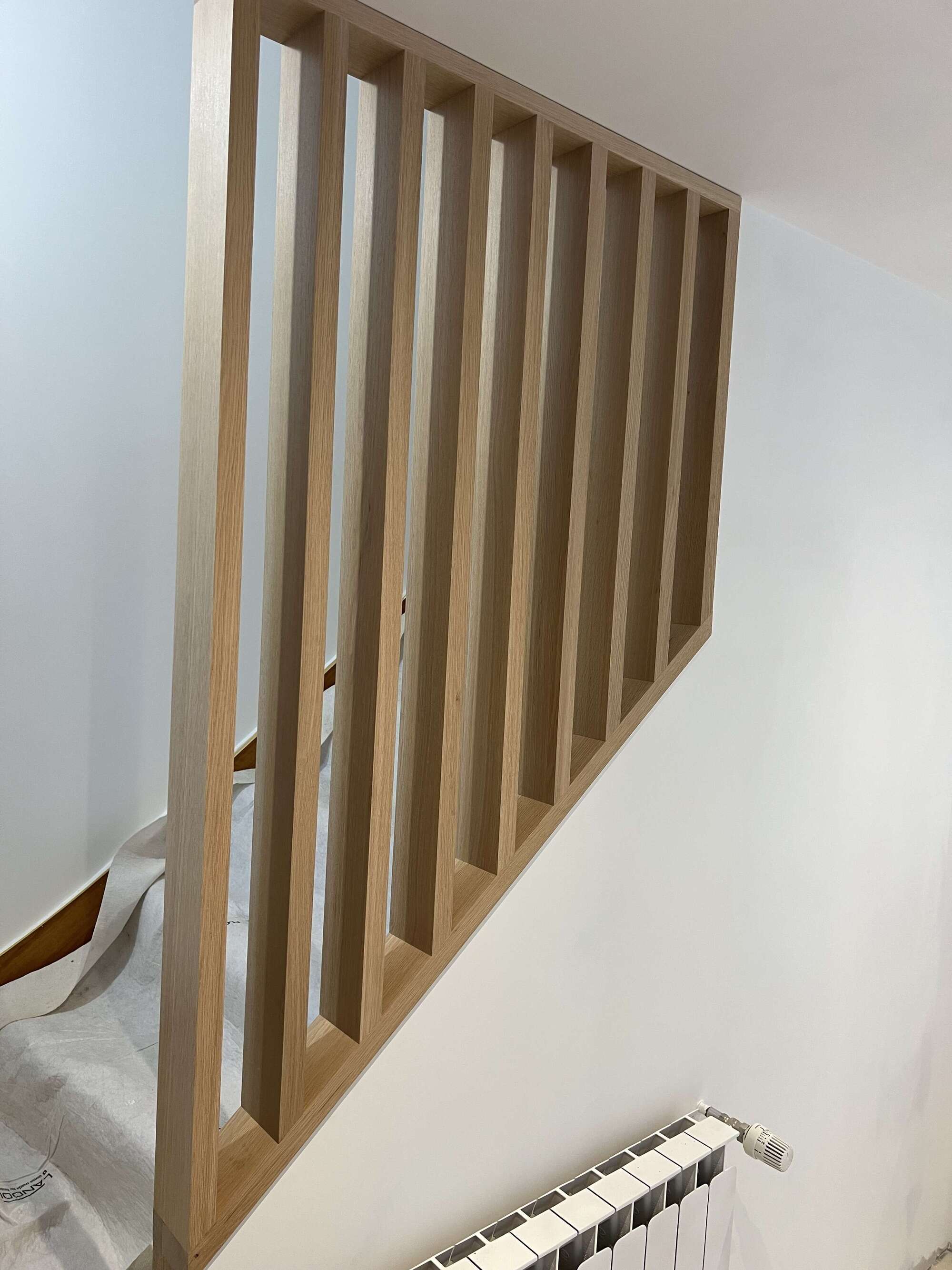 Habillage d'un escalier en béton,marches en chene massif,contremarches en médium peint.. Photos avant et après réalisation.
