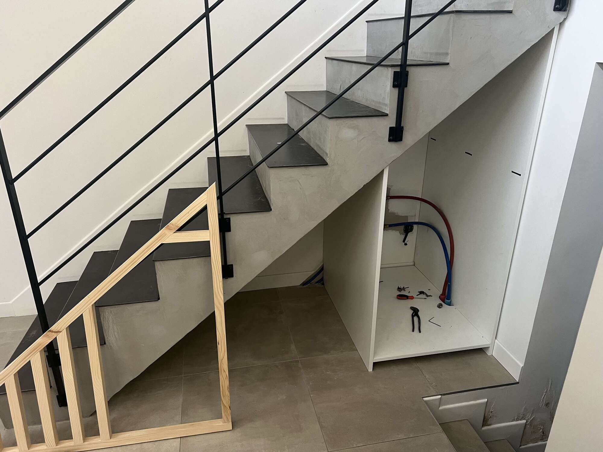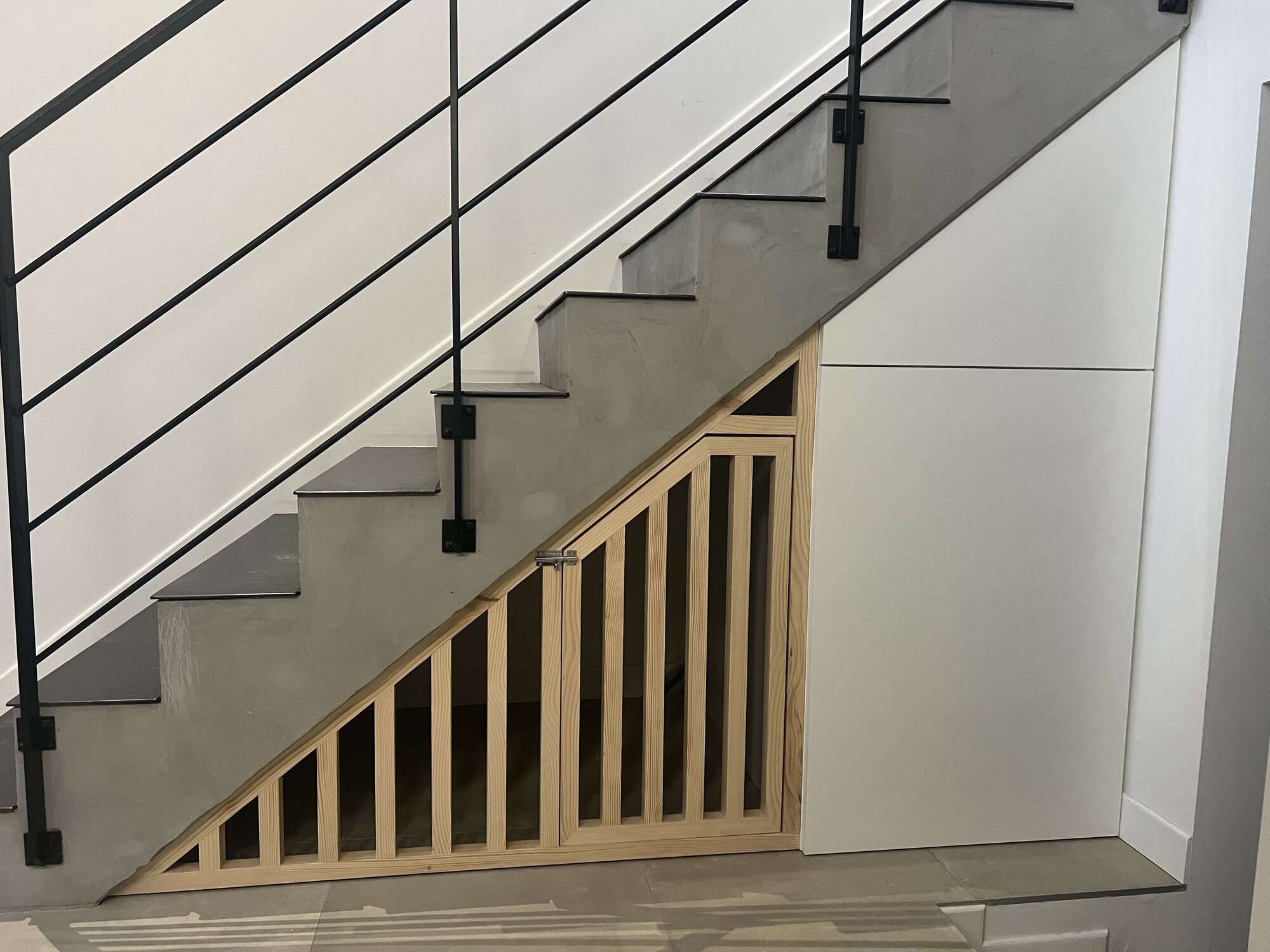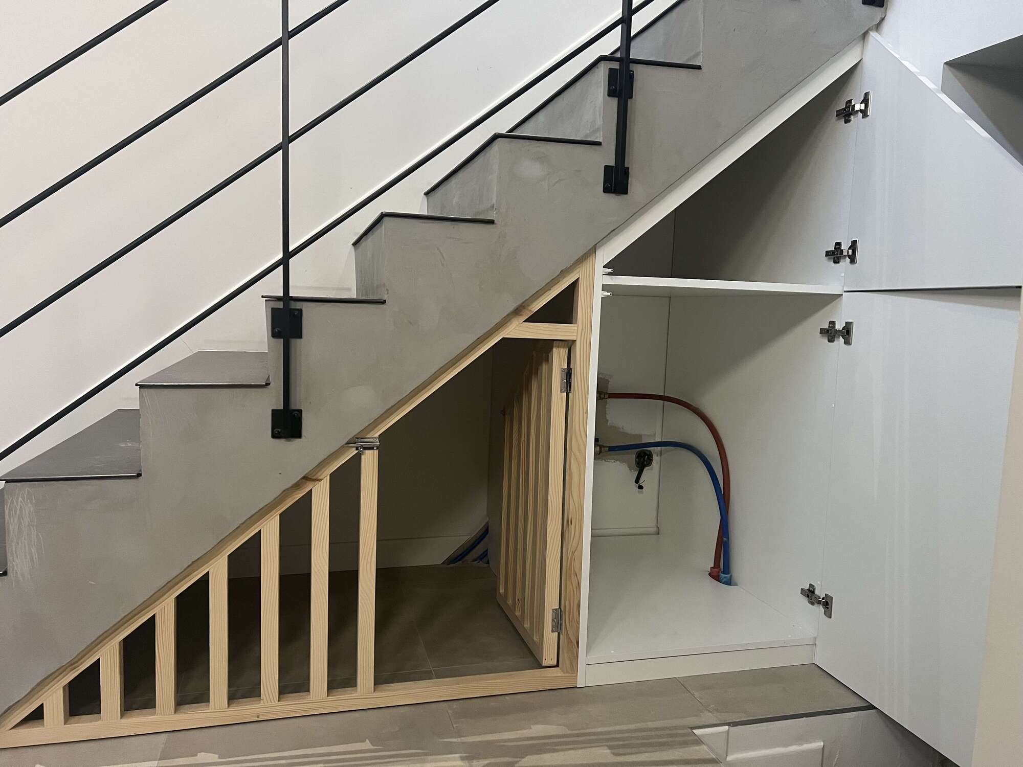 aménagement sur mesure d'un placard en mélaminé et d'une niche en bois massif avec porte,sous un escalier